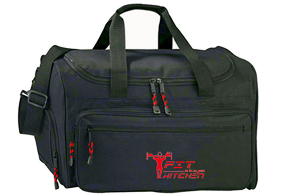 Excel Sport Bag (18") U zipper top, large front pocket, large end supper compartments netted for dirty clothes, open end pocket, double carry handles with detachable shoulder strap.